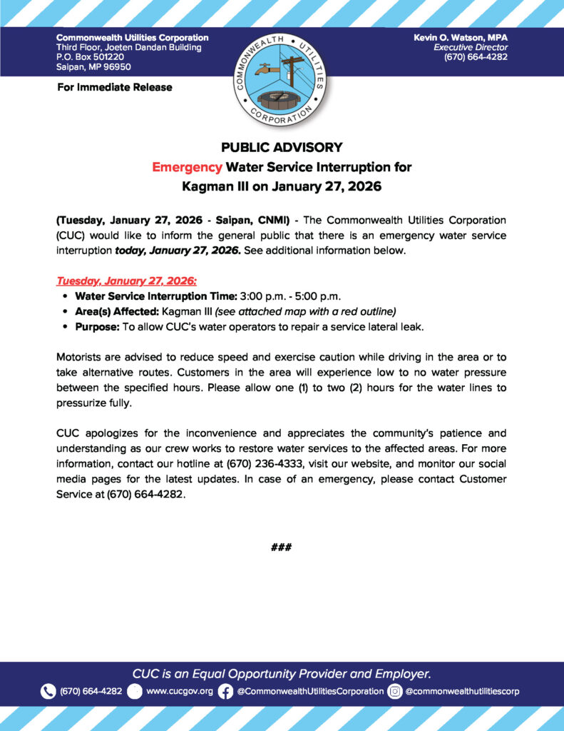 2026-01-27 Public Advisory re Emergency Water Service Interruption for Kagman III Today, January 27, 2026