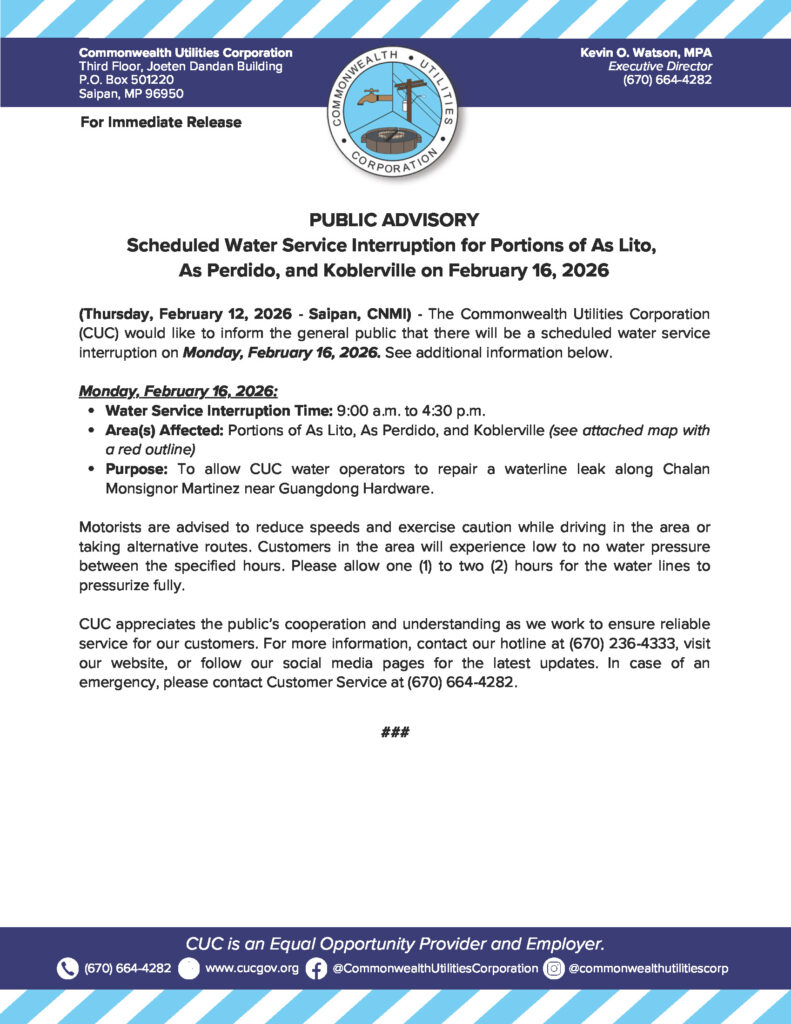 2026-02-12 Public Advisory re Scheduled Water Service Interruption for Portions of As Lito, As Perdido, and Koblerville on February 16, 2026