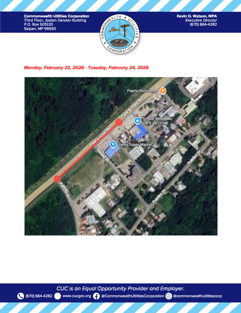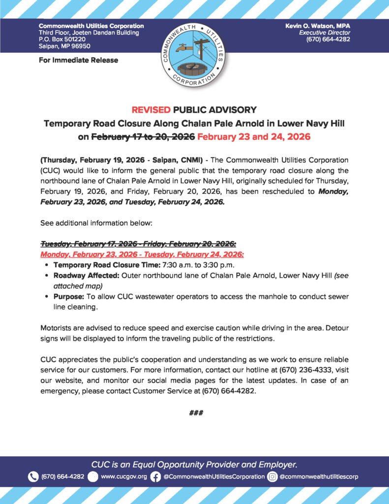 Home » News and Events » Public Advisories » 2026-02-19 Revised Public Advisory re Temporary Road Closure Along Chalan Pale Arnold, Lower Navy Hill on February 23 and 24, 2026