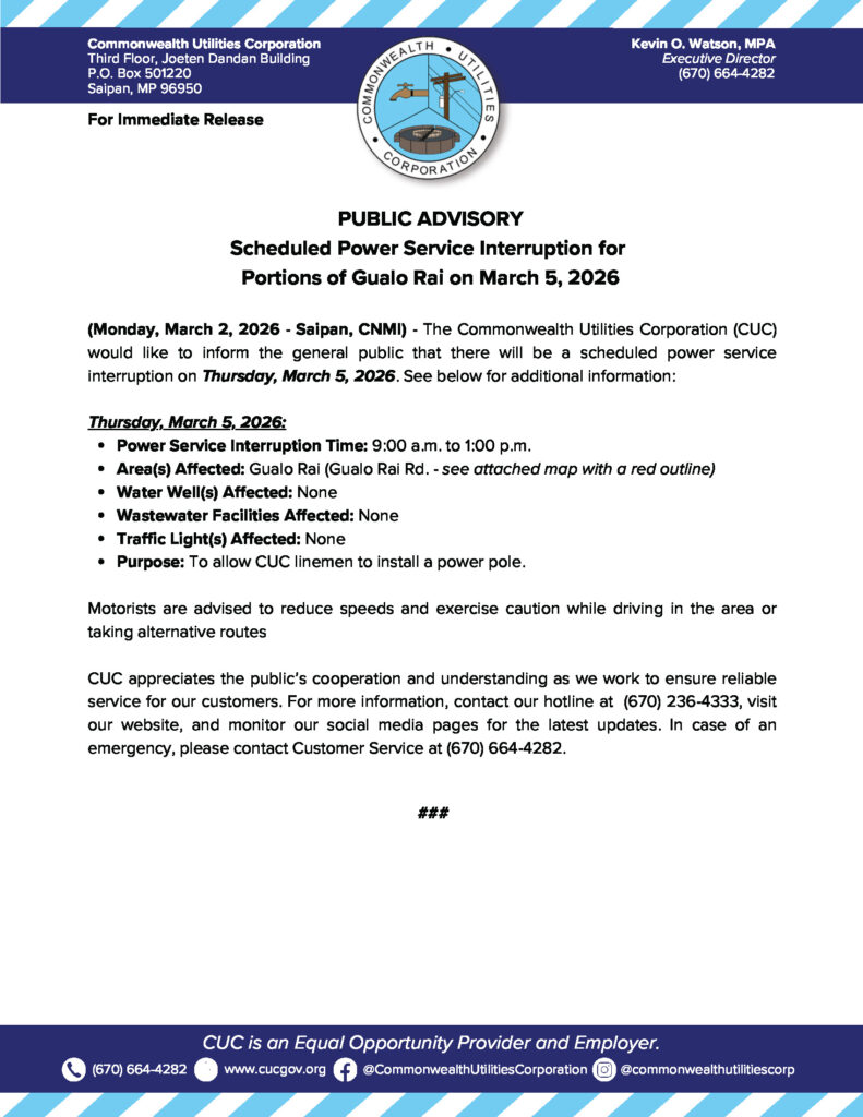 2026-03-02 Public Advisory re Scheduled Power Service Interruption for Portions of Gualo Rai on March 5, 2026