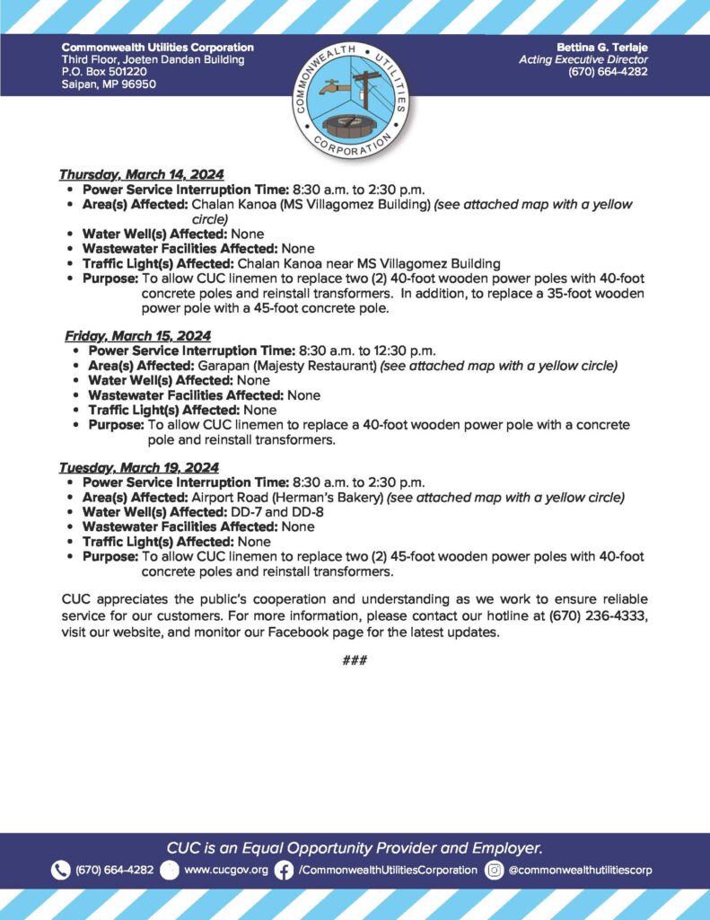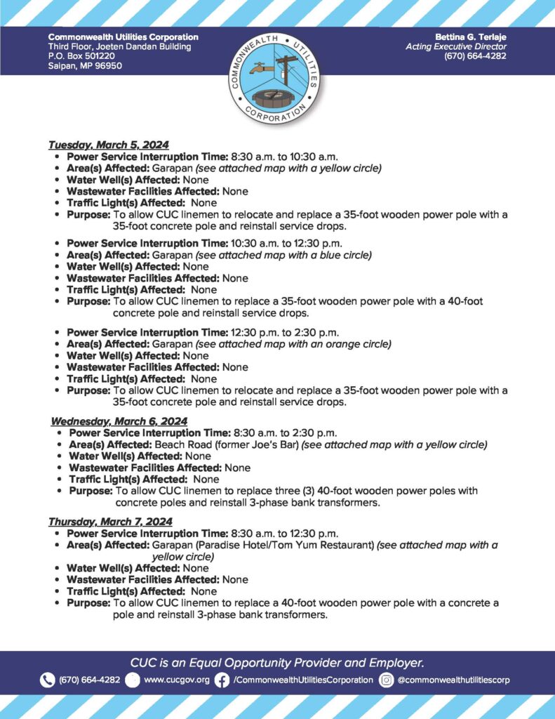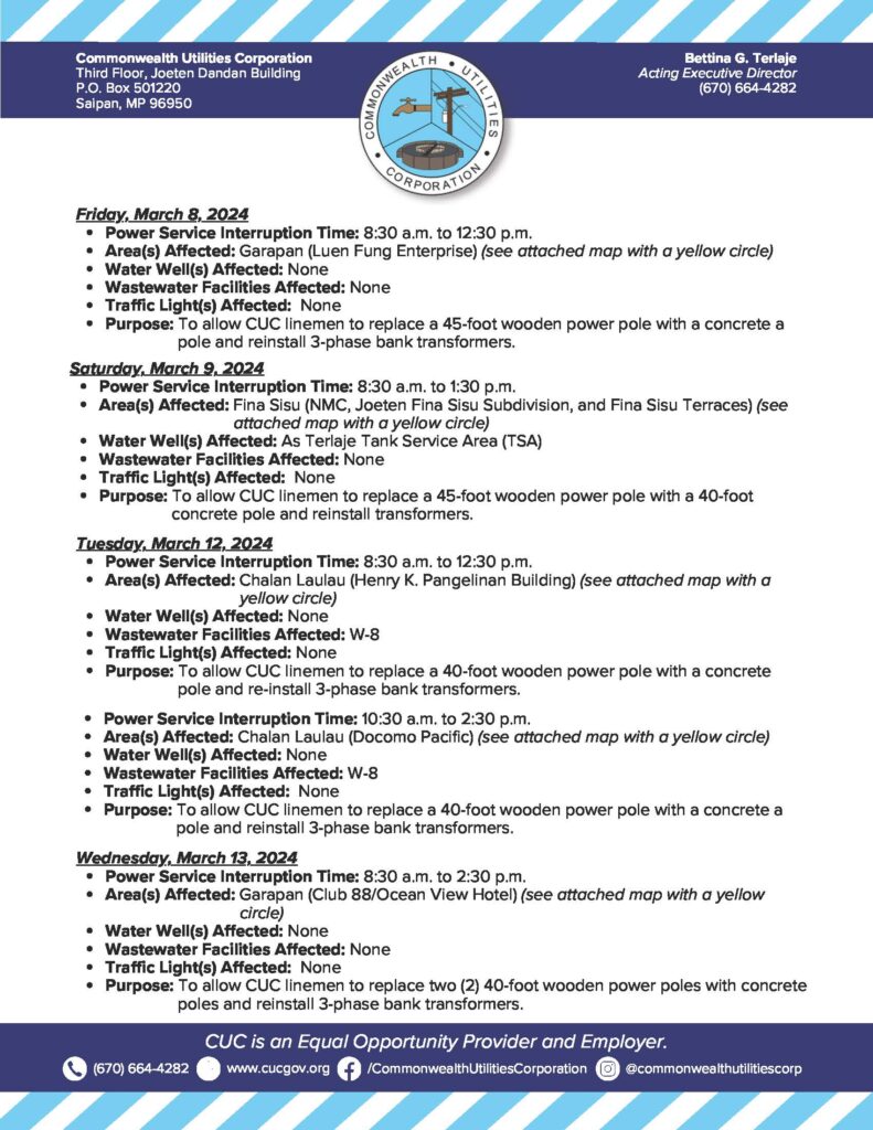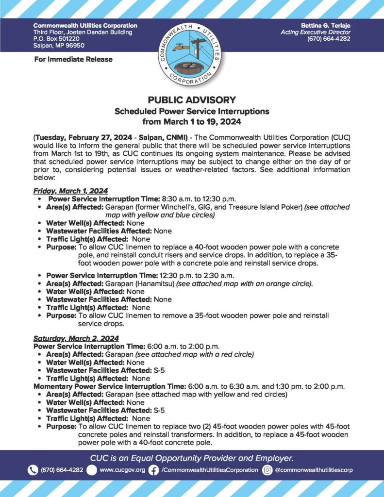 27-FEB-2024 Public Advisory re Scheduled Power Service Interruptions from March 1 to 19, 2024