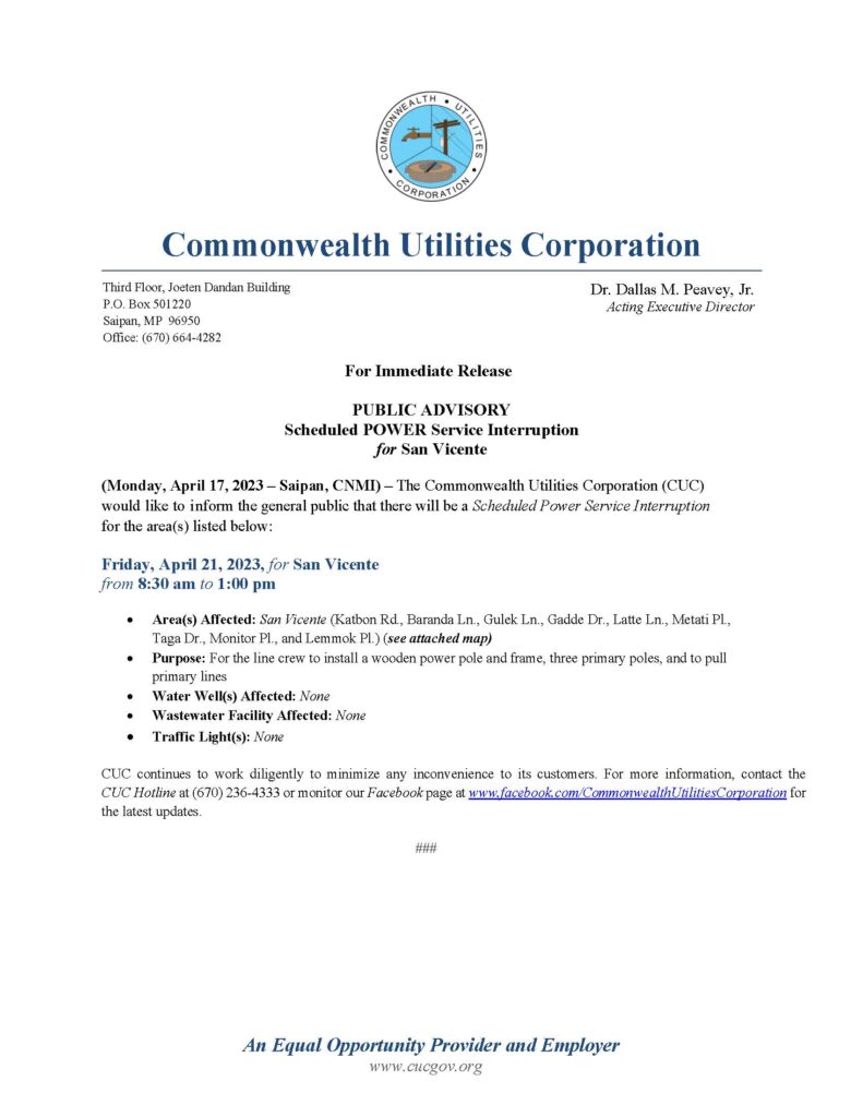 Home » News and Events » Public Advisories » For APR 21, Public Advisory re Scheduled POWER Service Interruption for San Vicente