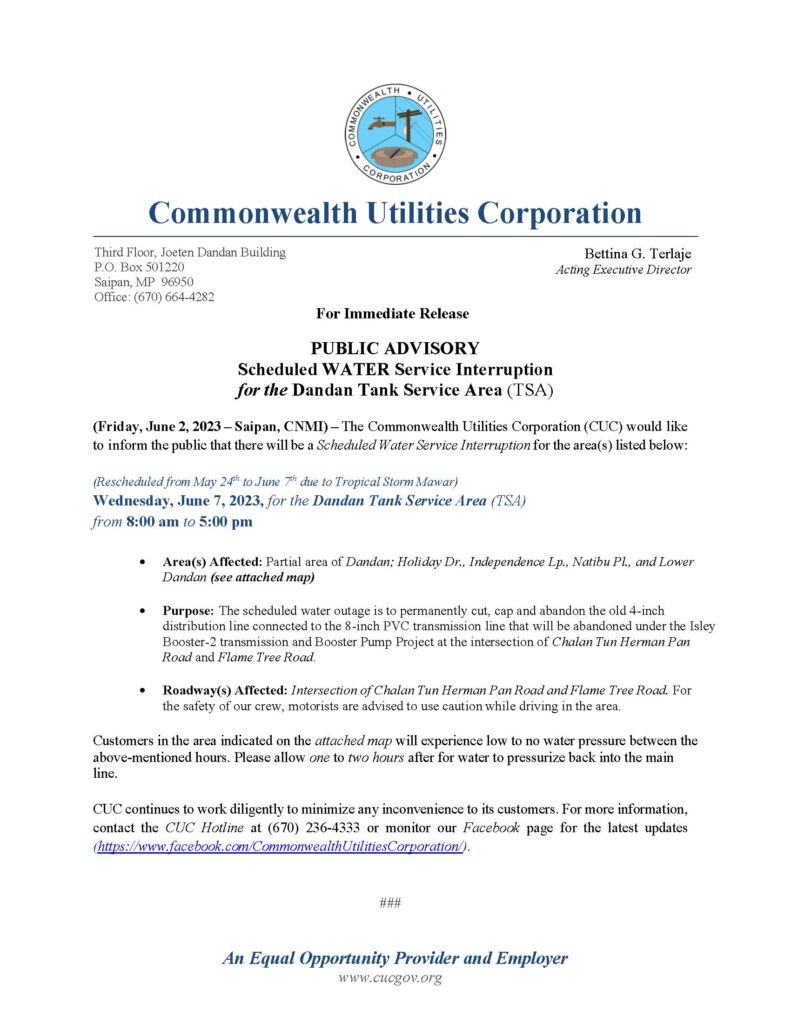 For JUNE 7, Public Advisory re Scheduled WATER Service Interruption for the Dandan TSA