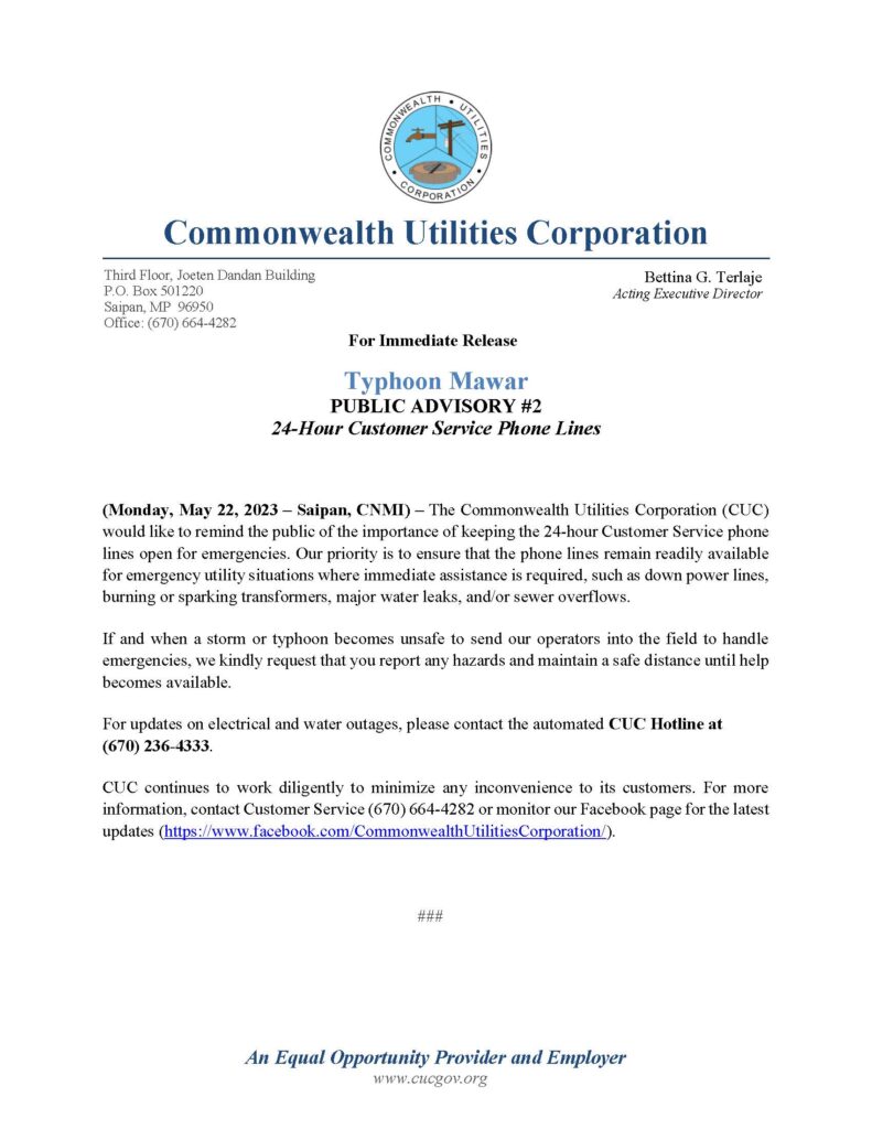 Home » News and Events » Public Advisories » Typhoon Mawar Public Advisory #2 Regarding Phone Lines (May 22)