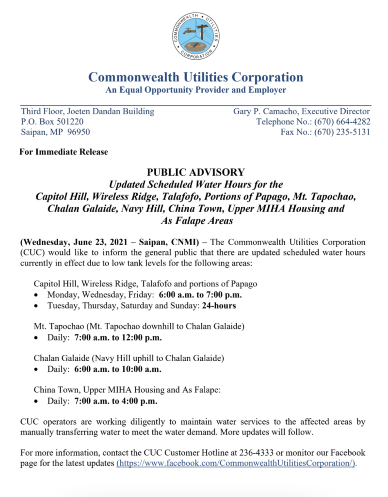 Updated Scheduled Water Hours | Capitol Hill, Wireless Ridge, Talafofo, Portion of Papago, Mt. Tapochao, Chalan Galaide, Navy Hill, China Town, Upper MIHA Housing and As Falape Area | June 23, 2021